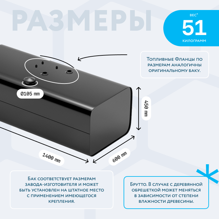 Бак немного отличается по размерам от оригинала, поэтому может быть установлен на штатное место только с применением креплений производства БАКОР к данному баку, а также с заменой датчика и топливозаборника из комплектующих к баку. Крепления производства БАКОР не подходят по отверстиям на раме, поэтому при покупке бака в сборе нужно будет сверлить раму, чтобы установить кронштейны БАКОР. Заливная горловина соответствует оригинальной по диаметру и расположению. Стальная полуоборотная заглушка с клапаном, без замка, а также сливная пробка (1/4" коническая, под шестигранник), включены в стоимость бака без комплектующих.