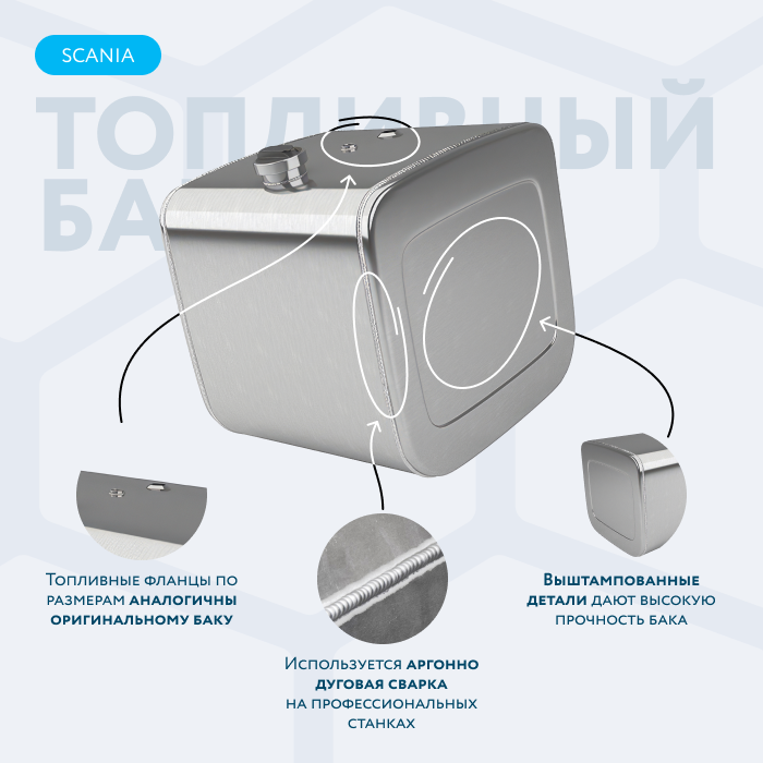 Алюминиевый бак не подвержен коррозии, что делает его более долговечным, а так же сбережет вашу топливную систему. Бак из алюминия в два раза легче стального бака, хотя он и изготовлен из листа увеличенной толщины в 2,5 мм. В конструкции предусмотрены цельные перегородки, которые проварены по периметру. Баки из алюминия так же оснащены заливной горловиной с самозапираемым непроливаемым клапаном (который становится барьером для разлива топлива, а так же становится защитой от попадания мусора в бак при открытой крышке) . Кроме того, однозначно что алюминиевый бак выглядит намного привлекательнее и дороже - где бак в том числе становиться и элементом тюнинга автомобиля. На алюминиеввые баки действует увеличенная гарантия - 36 месяцев.