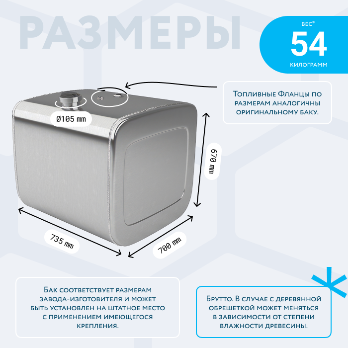 - Так же, если вы приобретаете алюминиевый топливный бак, он будет в деревянной обрешетке (для усиления защиты при транспортировке). При просчете веса и объема, цена за доставку может измениться по факту взвешивания на самом терминале транспортной компании. Так как деревянная обрешетка соответственно изготовлена из древесины, и она имеет свойство значительно набирать вес в зависимости от влажности окружающей среды.