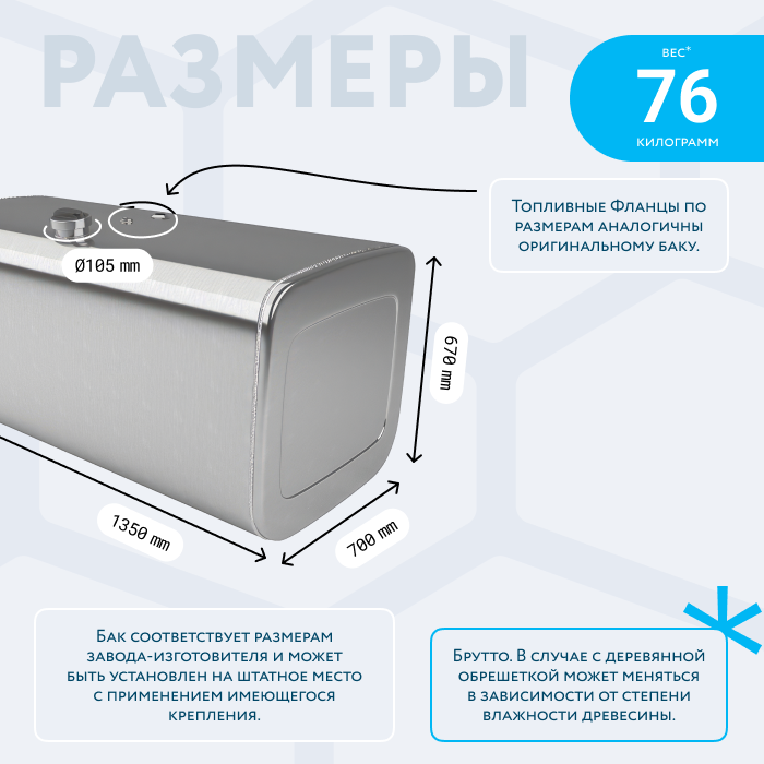 - Так же, если вы приобретаете алюминиевый топливный бак, он будет в деревянной обрешетке (для усиления защиты при транспортировке). При просчете веса и объема, цена за доставку может измениться по факту взвешивания на самом терминале транспортной компании. Так как деревянная обрешетка соответственно изготовлена из древесины, и она имеет свойство значительно набирать вес в зависимости от влажности окружающей среды.